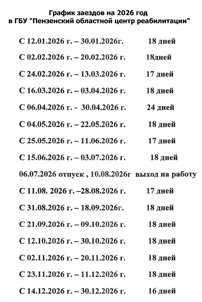 График заездов в ГБУ «Пензенский областной центр реабилитации» на 2026 год.